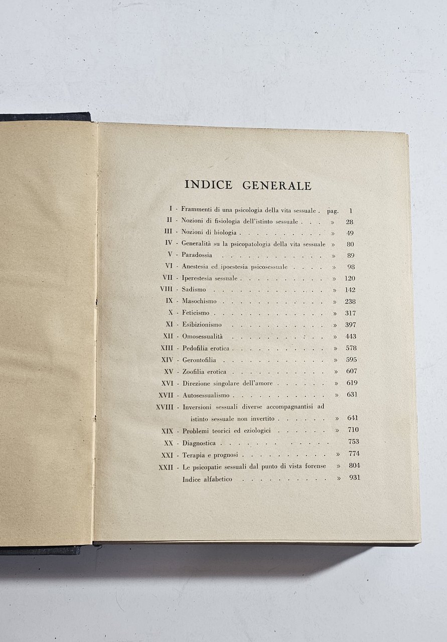 Volume ampio e articolato, con trattazione di numerosi casi clinici e analisi teoriche. Presente indice dettagliato con capitoli su masochismo, sadismo, feticismo, inversione sessuale e psicopatologie correlate.
