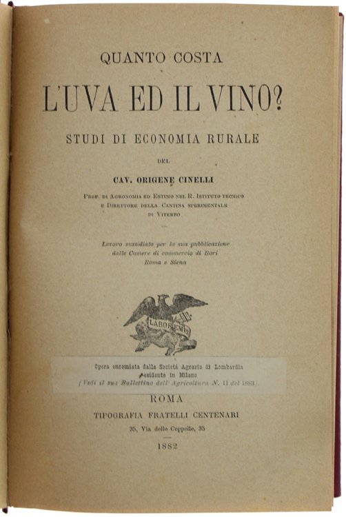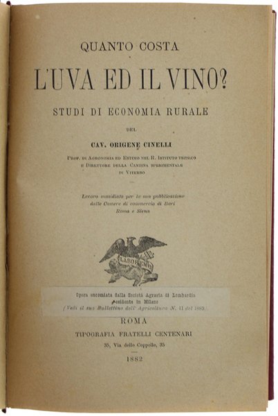 QUANTO COSTA L'UVA ED IL VINO? STUDI DI ECONOMIA RURALE. | Livres anciens et modernes | Cinelli Origene.