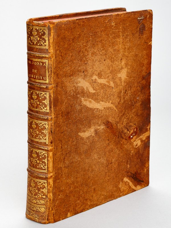 1 vol. in-4 reliure de l'époque pleine basane marron, dos à 5 nerfs orné, Chez Joseph Dalles, & Fris Vitrac, Toulouse, 1770, xii-28-567 pp. Bon état (frott. et qq. épidermures en plats, petit accroc discret en coiffe sup., bel état intérieur). Henri François d'Aguesseau (1668-1751) fut chancelier et garde des sceaux à plusieurs reprises, de 1717 à 1750. Sous Louis XV, il supervisa la préparation d'importantes ordonnances, notamment en matière de testaments et de substitutions. En droit de l'Ancien Régime, la substitution héréditaire désignait une disposition par laquelle on indiquait plusieurs héritiers successivement. Ce mécanisme permettait en particulier de garantir le maintien de la richesse foncière au sein des familles nobles. Il fut supprimé sous le Code Napoléon. Camus & Dupin, 1819, 731