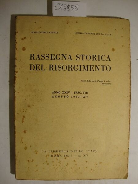 Pubblicazione mensile inviata gratuitamente ai Soci del Regio Istituto per la Storia del Risorgimento Italiano, del quale fu l'unica rivista. Disponibili vari fascicoli relativi all'anno 1937 - XXIV : Agosto, Novembre e Dicembre - DETTAGLIO DELLE CONDIZIONI : Segni d'invecchiamento con danni e con marginali strappetti. Fioriture sparse in coperta ed alle pagg. che non ledono la leggibilità del testo. Intonsi alle pagine - .