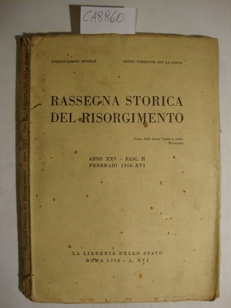 Pubblicazione mensile inviata gratuitamente ai Soci del Regio Istituto per la Storia del Risorgimento Italiano, del quale fu l'unica rivista. Disponibili vari fascicoli relativi all'anno 1938 - XXV : Febbraio, Settembre, Ottobre, Novembre e Dicembre - DETTAGLIO DELLE CONDIZIONI : Segni d'invecchiamento con danni e con marginali strappetti. Fioriture sparse in coperta ed alle pagg. che non ledono la leggibilità del testo. Intonsi alle pagine - .