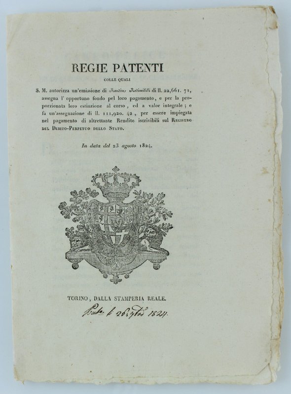 REGIE PATENTI colle quali S.M. autorizza un'emissione di Rendite Redimibili di ll. 22,662.72, assegna l'opportuno fondo pel loro pagamento. In data del 23 agosto 1824 [documento originale]