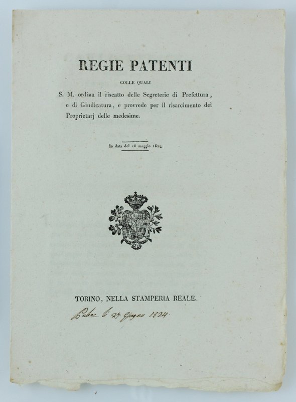REGIE PATENTI colle quali S.M. ordina il riscatto delle Segreterie di Prefettura e di Giudicatura e provvede per il risarcimento dei Proprietarj delle medesime. In data del 18 maggio 1824 [documento originale].
