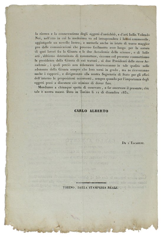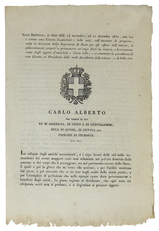 REGII BREVETTI in data delli 24 novembre, ed 11 dicembre 1832, con cui è creata una Giunta d'antichità e belle arti | Livres anciens et modernes | Carlo Alberto