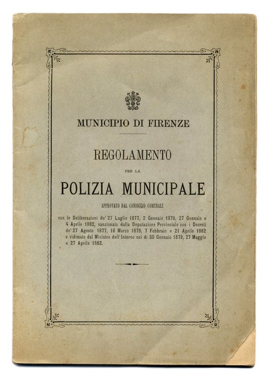 >in-16, pp. 46, brossura editoriale (comuni segni d'uso e difetto all'angolo inf. del piatto anteriore). Comprende le Deliberazioni de' 27 Luglio 1877, 2 Gennaio 1878, 27 Gennaio e 4 aprile 1882, sanzionato dalla Deputazione Provinciale con i Decreti de' 27 Agosto 1877... (fino al 1882). In fine la firma del sindaco Tommaso Corsini, il quale ebbe una parte preminente nella vita amministrativa di Firenze, in un momento particolarmente decisivo per lo sviluppo e la riorganizazzione urbanistica della città. Il corpo, nato con decreto granducale il 10 giugno 1852 e approvato il 4 agosto 1854, nel corso degli anni cambiò nome e regolamenti, che disciplinavano l'ordine pubblico, il decoro urbano e la viabilità. Ottimo esemplare.