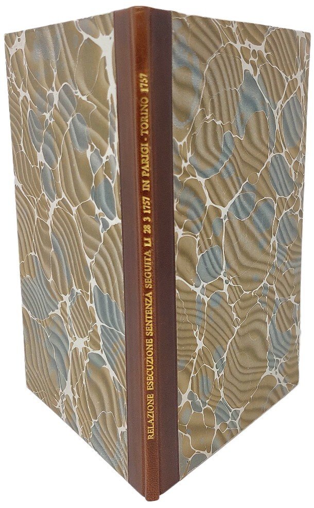 >in-4 piccolo (195x140 mm), pp. IV, legatura moderna in m. pelle, titolo oro al dorso. Rara plachetta che descrive, con crudo verismo, i supplizi e la feroce esecuzione capitale del Damiens, reo di aver attentato alla vita di Luigi XV il 5 gennaio 1757. La brutalità dell'evento, riportata in questa rara plachetta stampata a Parigi e Torino nello stesso anno, divenne simbolo dell'orrore giudiziario d'Antico Regime, citata anche nel Sorvegliare e punire di Foucault. Esemplare discreto, restauri al margine interno con perdita di qualche lettera e lieve alone d'umido.