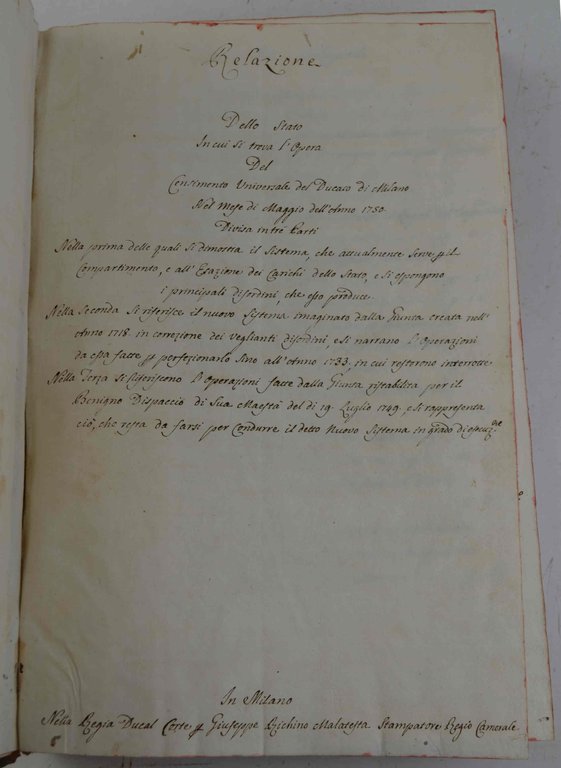 Relazione dello stato in cui si trova l'opera del censimento universale del Ducato di Milano nel mese di maggio dell'anno 1750...