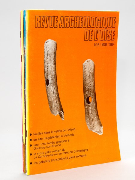 Revue archéologique de l'Oise (Lot de 5 numéros suivis : N°6, 7, 8, 9, 10) N°6 1975 : Fouilles dans la vallée de l'Aisne ; Un site magdalénien à Verberie ; Une riche tombe gauloise à Gournay sur Aronde ; Le vicus gallo-romain de La Carrière ru roi ; Les gobelets tronconiques gallo-romains ; N° 7 1976 : Les premiers agriculteurs et les Ages des Métaux en Picardie ; N° 8 : 1976 : Prospections aériennes dans l'Aisne ; Une paire d'entraves gallor-omaines ; Les décors sur céramique gallo-romaine dans le nord de la France ; Verberie : magdalénien et cabane de la Tène ; ; N° 9 : 1977 : Nouvelles découvertes de l'âge du bronze ; L'église de Noël Saint Martin ; N° 10 1977 : Sociologie des derniers chasseurs ; Site préhistorique d'Aux-Marais ; La