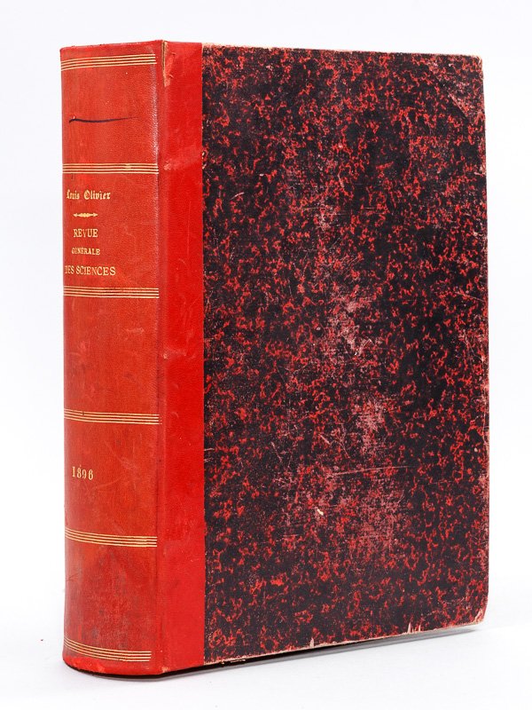 1 vol. fort in-4 rel. demi-basane riouge, dos à 6 faux-nerfs, nombr. ill. originales, Revue Générale des Sciences Pures et Appliquées, Georges Carré et C. Naud éditeurs, Paris, 1896, 1296 pp. , table des matières incluse Etat très satisfaisant (anciens cachets et étiq. intérieure d'instit. relig., couv. lég. frottée, bon état par ailleurs, avec intérieur frais). Contient de très nombreux articles, sur des sujets moins divers que les autres années, car souvent centrés sur des sujets liés à l'économie française de cette époque : Etat actuel de l'apiculture en France ; Etat actuel de la verrerie et de la cristallerie en France ; Les récents perfectionnement du phonographe ; Etat actuel et besoins de l'industrie des eaux-de-vie et liqueurs en France ; Etat actuel de l'industrie de la fonte en France ; Etat actuel de la navigation intérieure en France. Outre des articles originaux, la revue contient également d'intéressants revues d'ouvrages scientifiques de l'époque, ainsi que de thèses présentées à la Faculté des Sciences de Paris. Un ouvrage très riche en informations, mais qui reste d'une lecture aisée et agréable. Poids de 3,2 kg. Peu courant.
