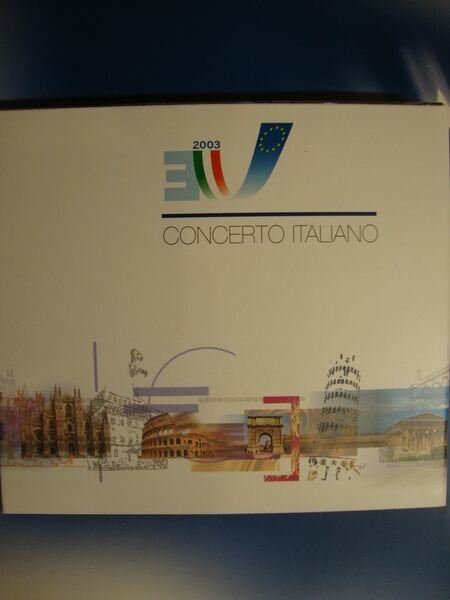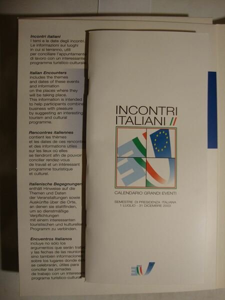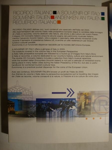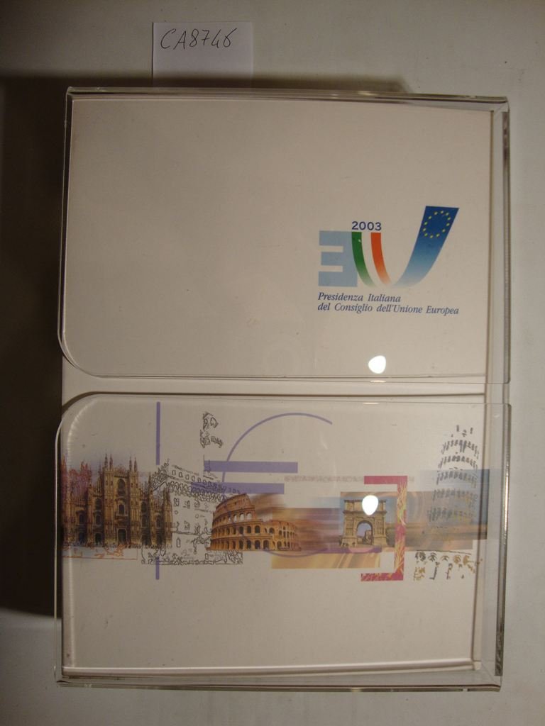 Confanetto contenente materiale informativo pubblicato in occasione della presidenza Europea italiana nel 2003. Il cofanetto include 2 voll. rispettivamente dal titolo - L'Italia nella prospettiva Europea - , in brossura edit. illustrata con lembi,pp. 167, ricc. ill. a col. n.t. e con cd contenente la completa traduzione in inglese e francese e - L'Italia si racconta - Natura, Storia, Cultura, Attraverso le immagini - , pp. 160, riccamente ill. a col. f.t. Sono inclusi inoltre: un opuscolo dal titolo - Incontri Italiani - , calendario dei grandi eventi del semestre di Presidenza italiana, dal 1 Luglio al 31 Dicembre 2003, un portamonete che coniuga design e razionalità, un piccolo dispencer tascabile per le monete della valuta UE, un doppio cd musicale con compilation di autori e interpreti italiani che include brani del repertorio operistico e concertistico, e alcune canzoni celebri in tutto il mondo. Ricordo italiano delinea con i suoi contenuti uno spaccato dell'Italia del 2003. Alle argomentazioni del volume l'Italia nella prospettiva europea segue la carrellata delle immagini del secondo volumetto, dedicato alla natura, alla storia ed alla cultura del nostro paese .