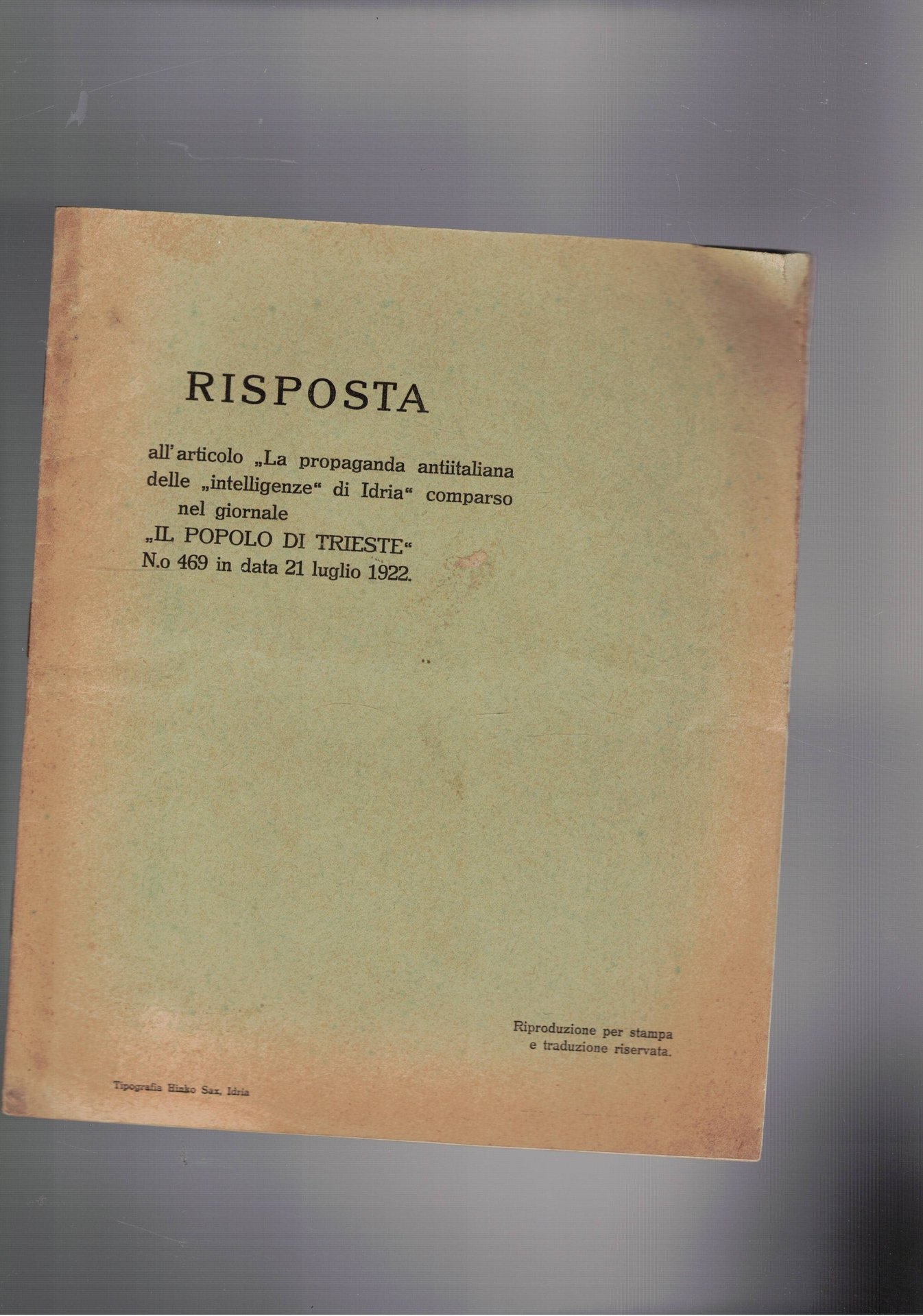Risposta all'articolo "la propaganda antiitaliana delle "intelligenze di Idria" comparso nel giornale "il Popolo di Trieste" in data 21 luglio 1922. le vidende di chi era schirato con le nazioni perdenti. | Livres anciens et modernes | Znidersic Francesco Preside Le Liceo Di Idria.