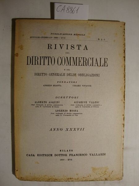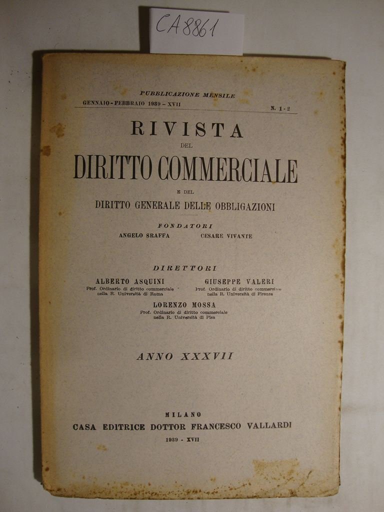 Pubblicazione bimestrale fondata da Angelo Sraffa e Cesare Vivante - Direttori Alberto Asquini, Giuseppe Valeri e Lorenzo Mossa. Disponibili tutti i fascicoli relativi all'anno 1939: Gennaio-Febbrario (1-2), Marzo-Aprile (3-4). Maggio-Giugno (5-6), Luglio-Agosto (7-8), Settembre-Ottobre (9-10) e Novembre-Dicembre (11-12) - DETTAGLIO DELLE CONDIZIONI : Segni d'invecchiamento con danni e con marginali strappetti. Fioriture sparse in coperta ed alle pagg. che non ledono la leggibilità del testo. Intonsi alle pagine - .