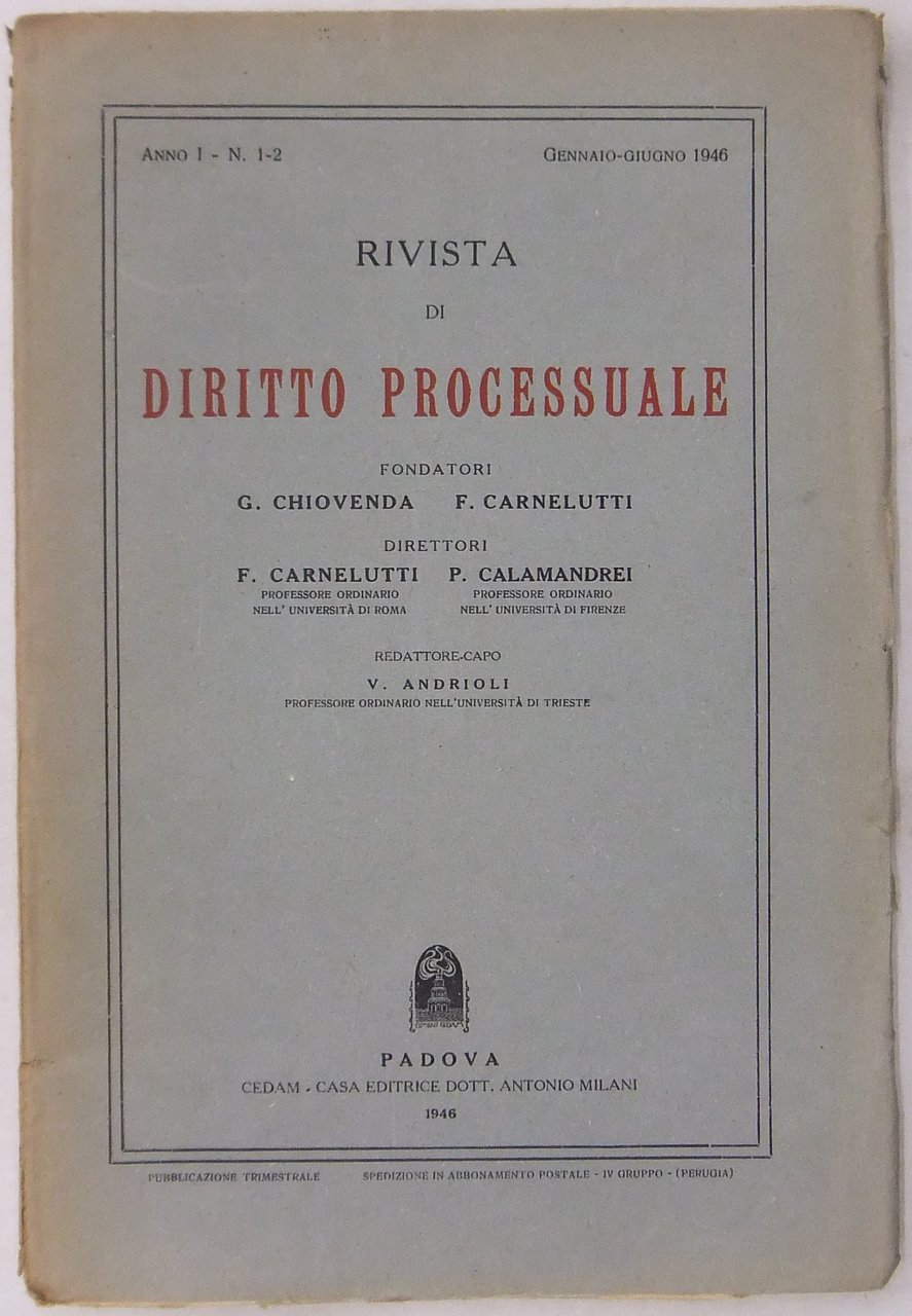Rivista di Diritto Processuale. Annata 1946. Diretta da: Francesco Carnelutti, Giuseppe Chiovenda, Piero Calamandrei, Enrico Tullio Liebman. Anno I (Seconda Serie)