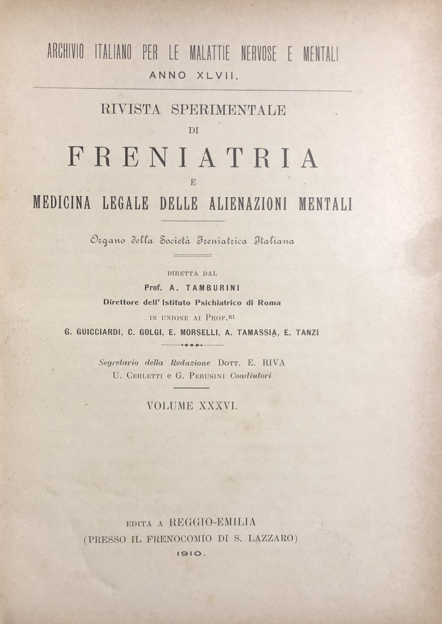 Rivista sperimentale di freniatria e di medicina legale delle alienazioni mentali. Organo della società freniatrica italiana. Vol. XXXVI - Anno 1910