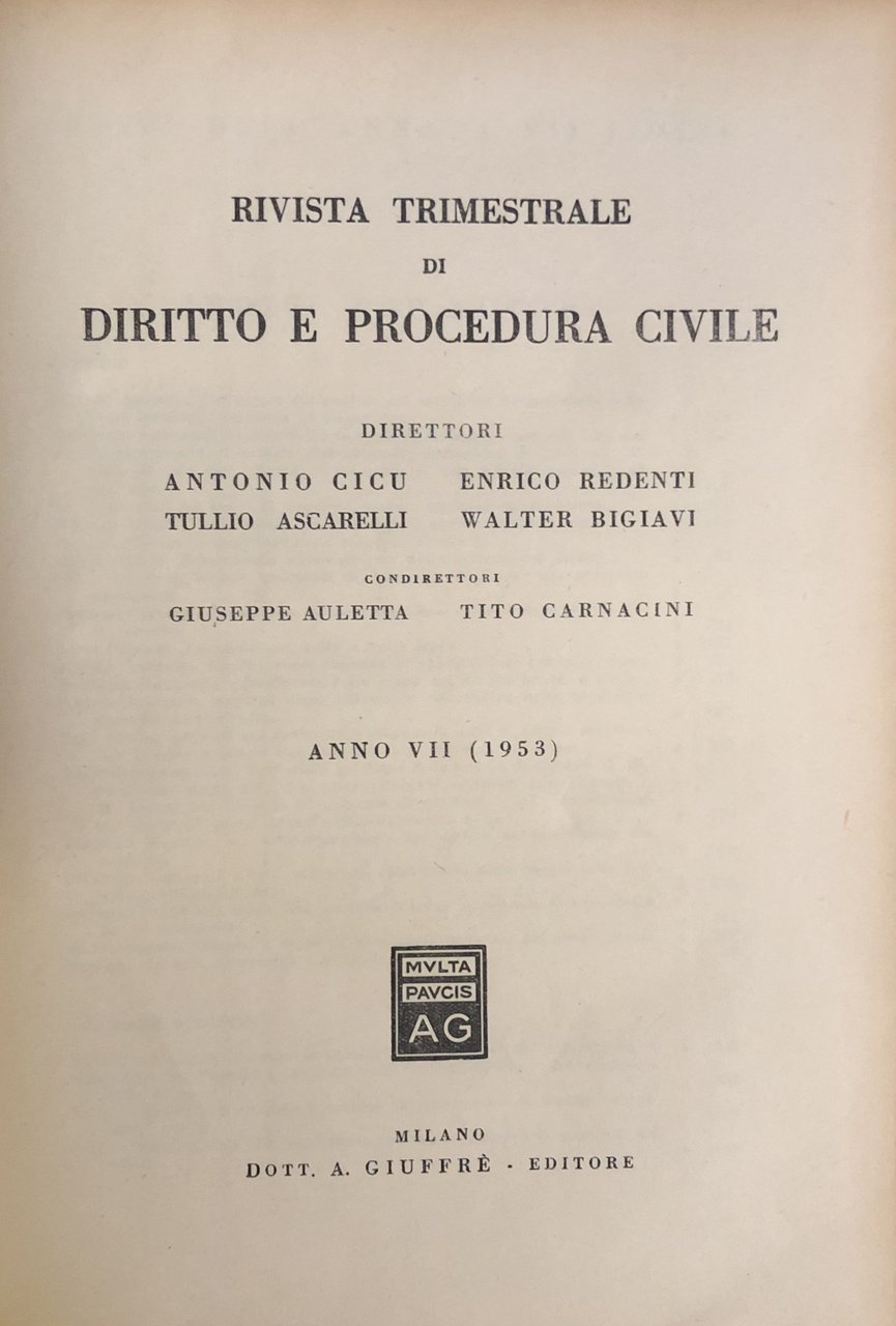 Rivista trimestrale di diritto e procedura civile. Diretta da: Antonio Cicu, Enrico Redenti, Tullio Ascarelli, Walter Bigiavi, Giuseppe Auletta, Tito Carnacini. Anno VII - 1953
