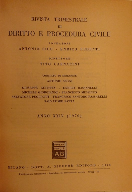 Rivista trimestrale di diritto e procedura civile. Fondata da: A. Cicu e E. Redenti. Diretta da: G. Auletta, E. Bassanelli, T. Carnacini, M. Giorgianni, F. Messineo, S. Pugliatti, F. Santoro Passarelli, S. Satta, A. Segni. Anno XXIV - 1970