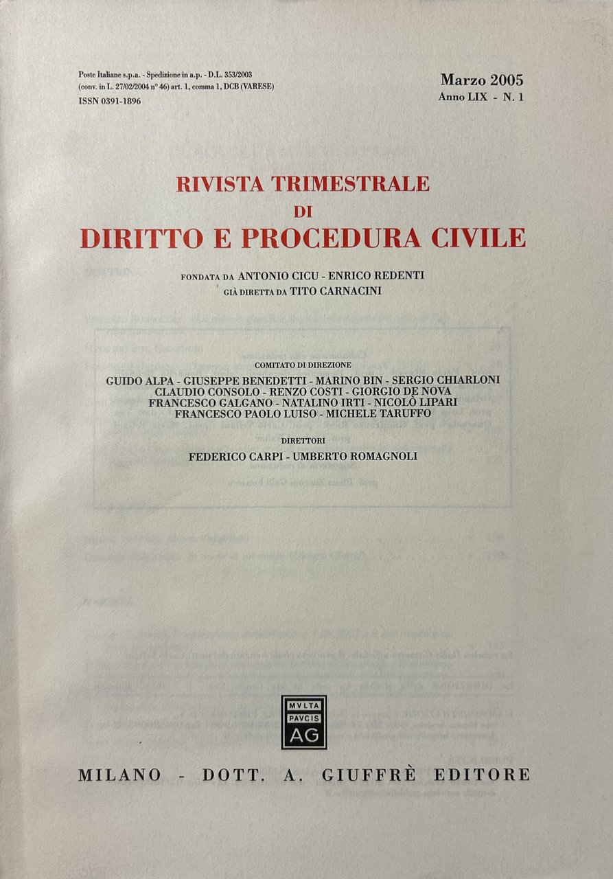 Rivista trimestrale di diritto e procedura civile. Fondata da: A. Cicu, E. Redenti e T. Carnacini. Diretta da: G. Alpa, G. Debenedetti, M. Bin, S. Chiarloni, C. Consolo, R. Costi, G. De Nova, F. Galgano, N. Irti, N. Lipari, F.P. Luiso, M. Taruffo. Anno LIX - 2005