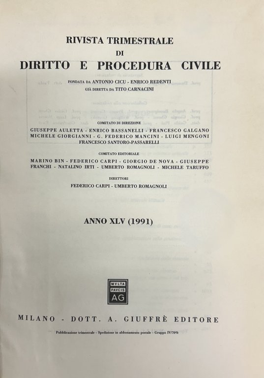 Rivista trimestrale di diritto e procedura civile. Fondata da: A. Cicu, E. Redenti e T. Carnacini. Diretta da: G. Auletta, E. Bassanelli, M. Bin, F. Carpi, G. De Nova, G. Franchi, F. Galgano, M. Giorgianni, N. Irti, G.F. Mancini, L. Mengoni, U. Romagnoli, F. Santoro Passarelli, M. Taruffo. Anno XLV - 1991