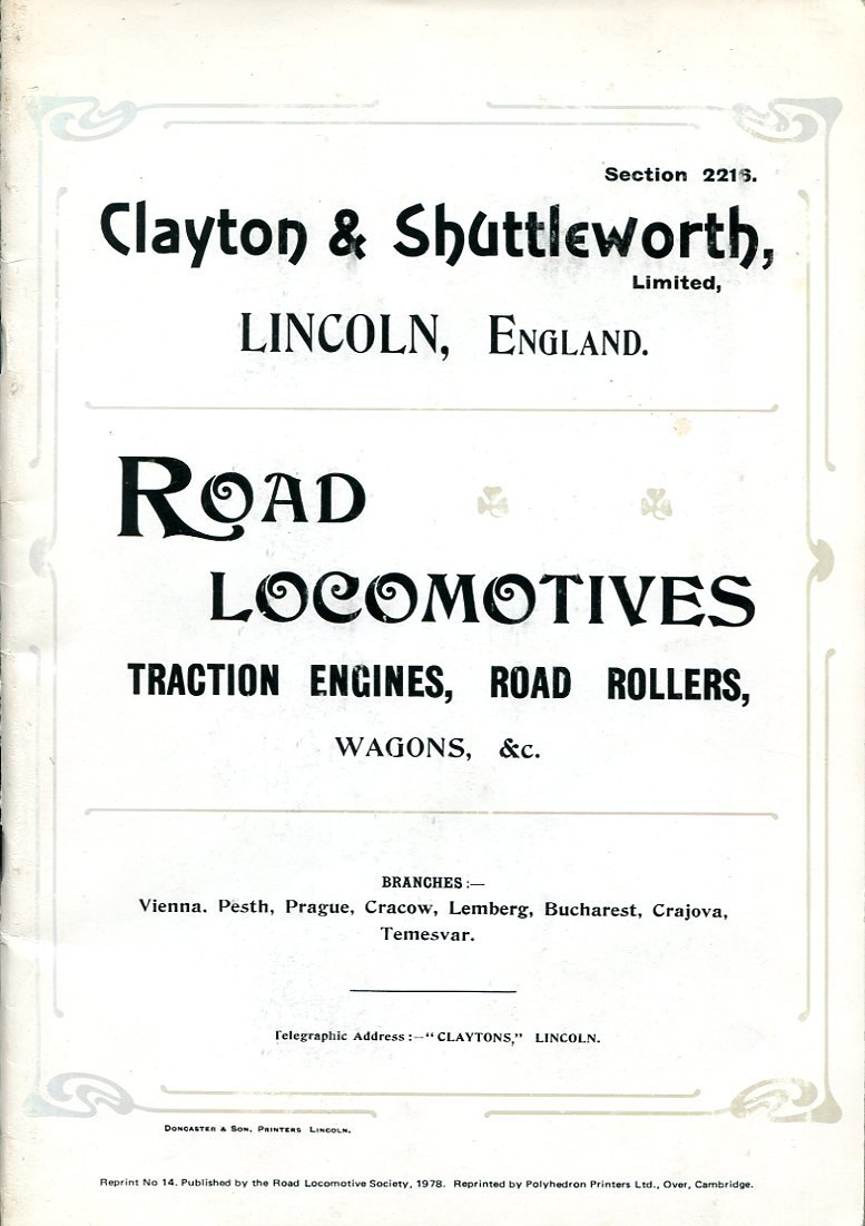 No marks or inscriptions to contents. No creasing to covers. A clean very tight copy with very slightly marked boards and no bumping to corners. 48pp. A 1978 reprint of a Clayton & Shuttleworth Ltd of Lincoln illustrated catalogue from around 1910 with photographs and drawings and technical information for their range of road locomotives including traction engines, road rollers, wagons, agricultural locomtives, scarifier, crane, sleeping van etc. Clayton & Shuttleworth were one of the top firms for these products in the country. Undated with a photo of their exhibit at the Grand Prix Paris of 1900. Extremely scarce.