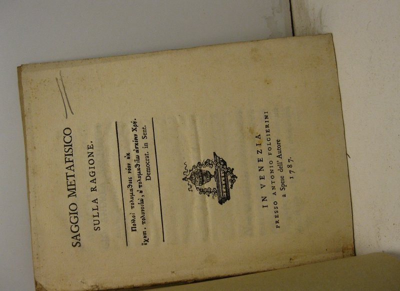 In 16, pp. 40. Br. rifatta con indicazioni bibliografiche manoscritte al p. ant. Saggio anonimo, attribuito a Gioachino Tosi, segretario per le lettere latine di Pio VII, poi vescovo di Anagni dal 1804 al 1814. Dedica a stampa al Cardinale Gio. Andrea Archetti legato a latere di Bologna. Melzi, III, p. 14.