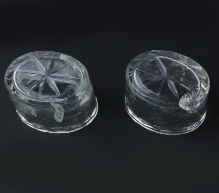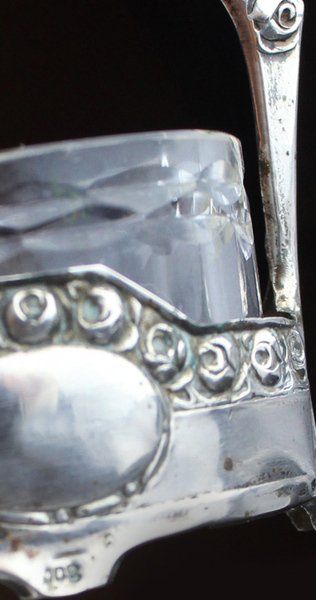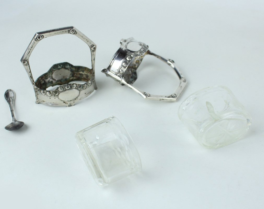 (Codice ZZ/0727) Set originale primo '900: due "cestini" in argento 800 con decorazione liberty a roselline, 1 mini cucchaio argentato in parte ossidato (mm 63), due coppette ovali in vetro molato (integre e prive di sbeccature ma la pasta del vetro mostra varie imperfezioni interne). Ogni cestino misura cm 5x3,5, altezza cm 6,5. ~~~ SPEDIZIONE IN ITALIA SEMPRE TRACCIATA