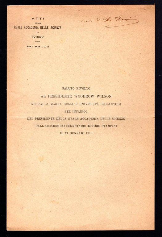 Saluto rivolto al Presidente Woodrow Wilson nell'Aula Magna della R. Università degli Studi per incarico del Presidente della Reale Accademia delle Scienze dall'accademico segretario Ettore Stampini il VI fennaio 1919