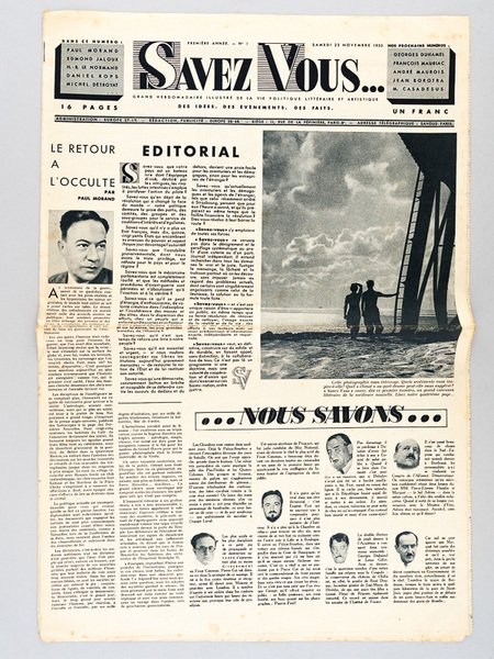 1 numéro in-folio, Savez-Vous. Grand hebdomadaire illustré de la vie politique littéraire et artistique (Numéro 1 - Première Année - Samedi 23 novembre 1935) Des Idées, des Evènements, des Faits., 16 pp. Rare exemplaire de ce premier numéro qui s'ouvre sur un texte de Paul Morand : "Le retour à l'occulte". Bon état. L'hebdomadaire ne dépassa pas l'année 1936