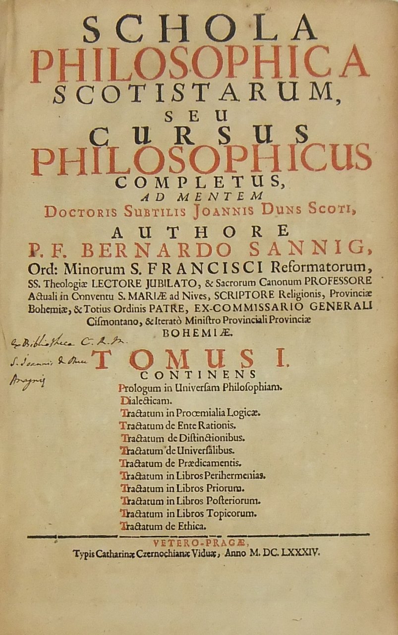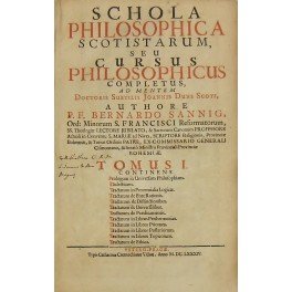 Schola philosophica scotistarum seu cursus philosophicus completus ad mentem Doctoris Subtilis Joannis Duns Scoti. Tomus I (unico pubblicato) - Continens Prologum in Universam Philosophiam. Dialecticam. Tractatum in Proemialia Logicae. Tractatum de Ente Rationis. Tractatum de Distinctionibus. Tractatum de Universalibus. Tractatum de Praedicamentis. Tractatum in Libros Perihermenias. Tractatum in Libros Priorum. Tractatum in Libros Posteriorum. Tractatum in Libros Topicorum. Tractatum de Ethica | Livres anciens et modernes | Sannig Bernhard (1638-1704)