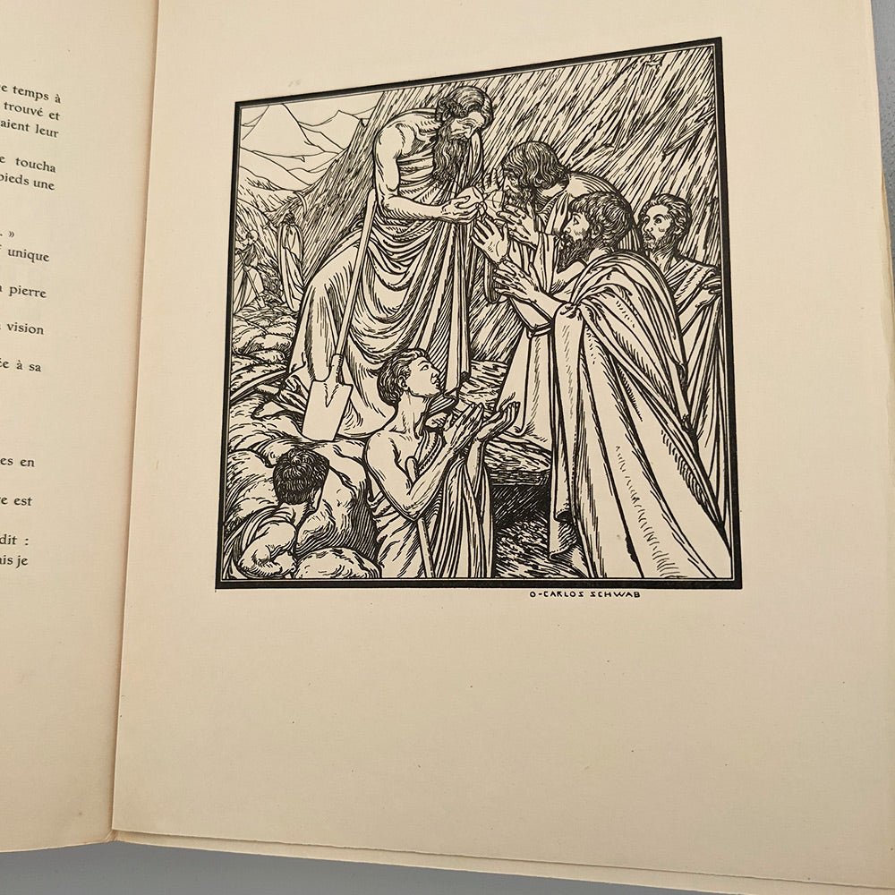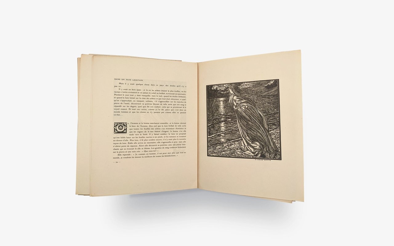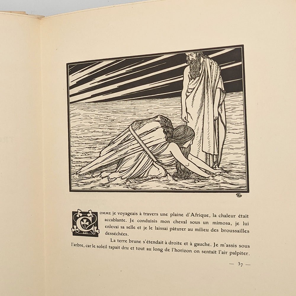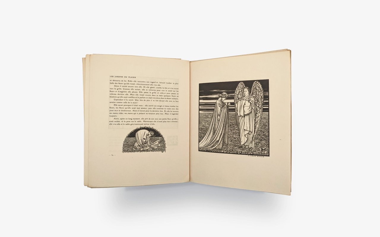The impressive illustrations are engraved by Richer et Cie successors. The drawings sometimes constructed with black, sometimes with white, are of a very great poetry in an art nouveau symbolist style. In full page, in the text, in tailpiece and in initials.