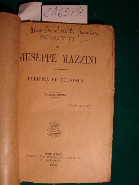 Primo di quattro volumi, in se completo, del programma di pubblicazione degli scritti di Mazzini per Sonzogno - DETTAGLIO DELLE CONDIZIONI : Coperta artigianale con fogli di protezione ai piatti e adesivo al dorso con titoli scritti a mano. Segni da studio a matita sparsi alle pagg., fioriture sparse che non ledono la leggibilità del testo - .