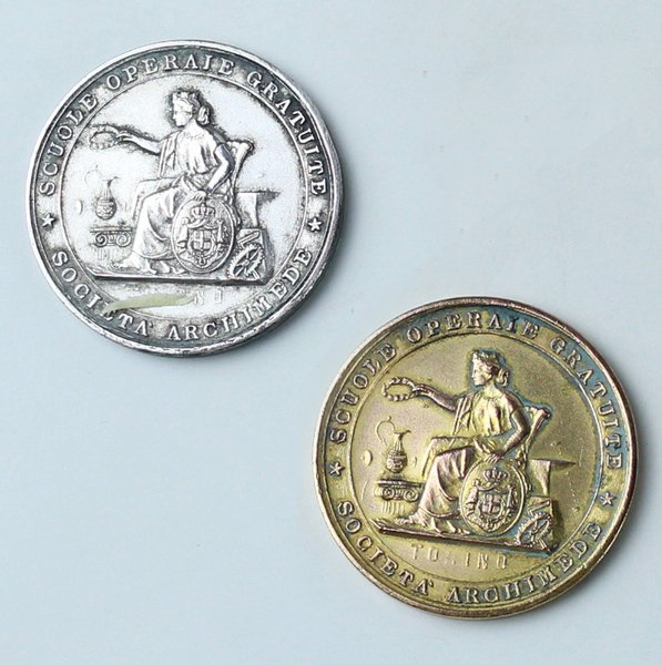 SOCIETA' ARCHIMEDE - SCUOLE OPERAIE GRATUITE TORINO; COPPIA DI MEDAGLIE PREMIO
