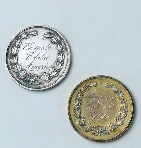 (Codice ZZ/0626) Due medaglie - una dorata, una argentata, diametro mm 30. Non datate, 1900 circa. Illustrate con la stessa immagine: l'Italia, tra vari simboli del sapere, porge una corona di lauri e regge lo stemma sabaudo. Al verso il medesimo nome inciso in corsivo ~~~ SPEDIZIONE IN ITALIA SEMPRE TRACCIATA