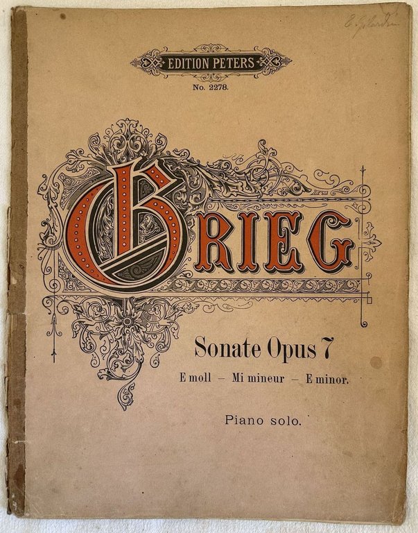 Edizione dei primi del novecento di questo spartito per pianoforte del compositore Edvard Grieg "Sonate" dall'opera 7. Discrete condizioni. Legatura in discrete condizioni. Piatti in parte staccati e rinforzo al dorso. In 4. cm 31x24. pp. 23. Edition of early XX century of this musical score for piano by the composer Edvard Grieg "Sonate" from the opera 7. good conditions. Binding in fair conditions. Plates are partially detached and the spine is reinforced. In 4. cm 31x24. pp. 23.