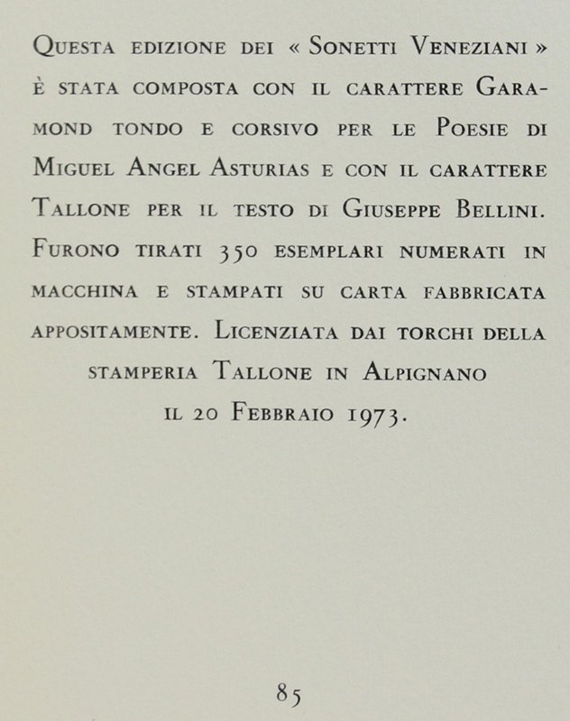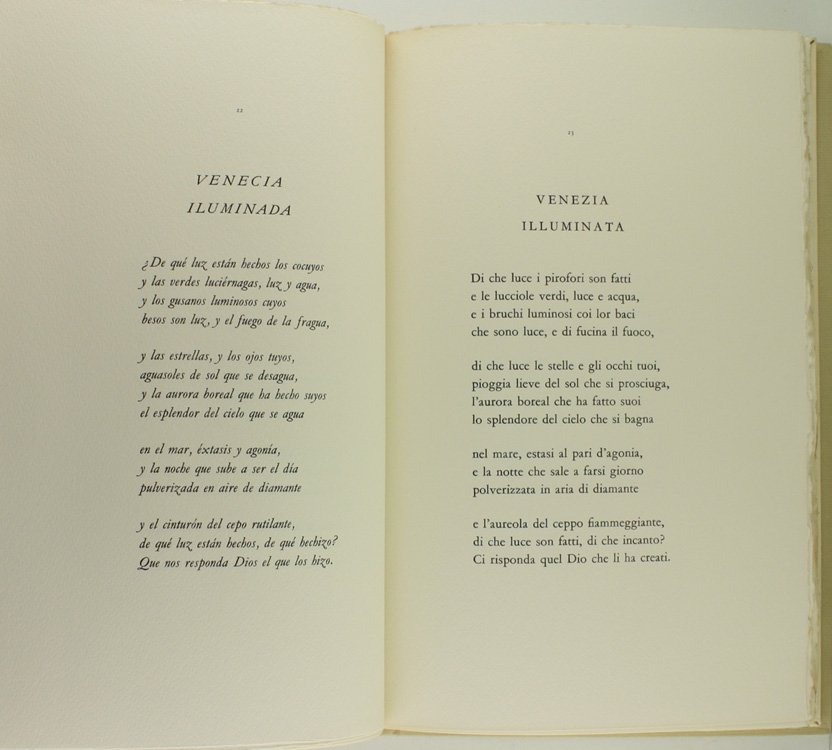 (Codice CV/2039) In 4º (33,5x21 cm) 48(3) pp. Raffinata edizione, tiratura di 350 copie numerate, esemplare n. 85. Impressa nei caratteri Garamond e Tallone, su carta speciale appositamente fabbricata, grandi margini con barbe. Testo originale e traduzione a fronte di Letizia Falzone. Con un profilo dell'autore di Giuseppe Bellini. Brossura originale con risvolti, entro camicia cartonata, titolo oro al dorso, nel cofanetto editoriale (lievi ingialliture). Volume splendido, freschissimo: come nuovo. ~~~ SPEDIZIONE IN ITALIA SEMPRE TRACCIATA