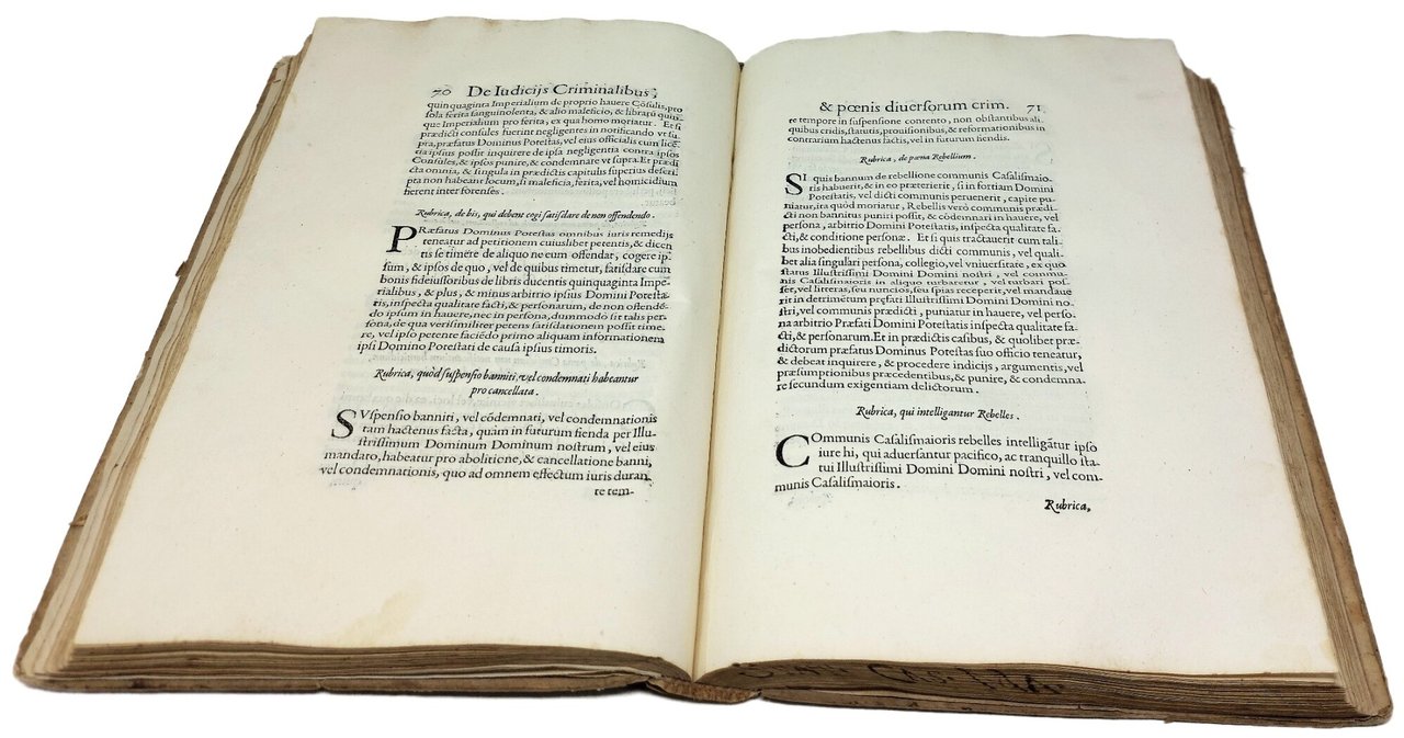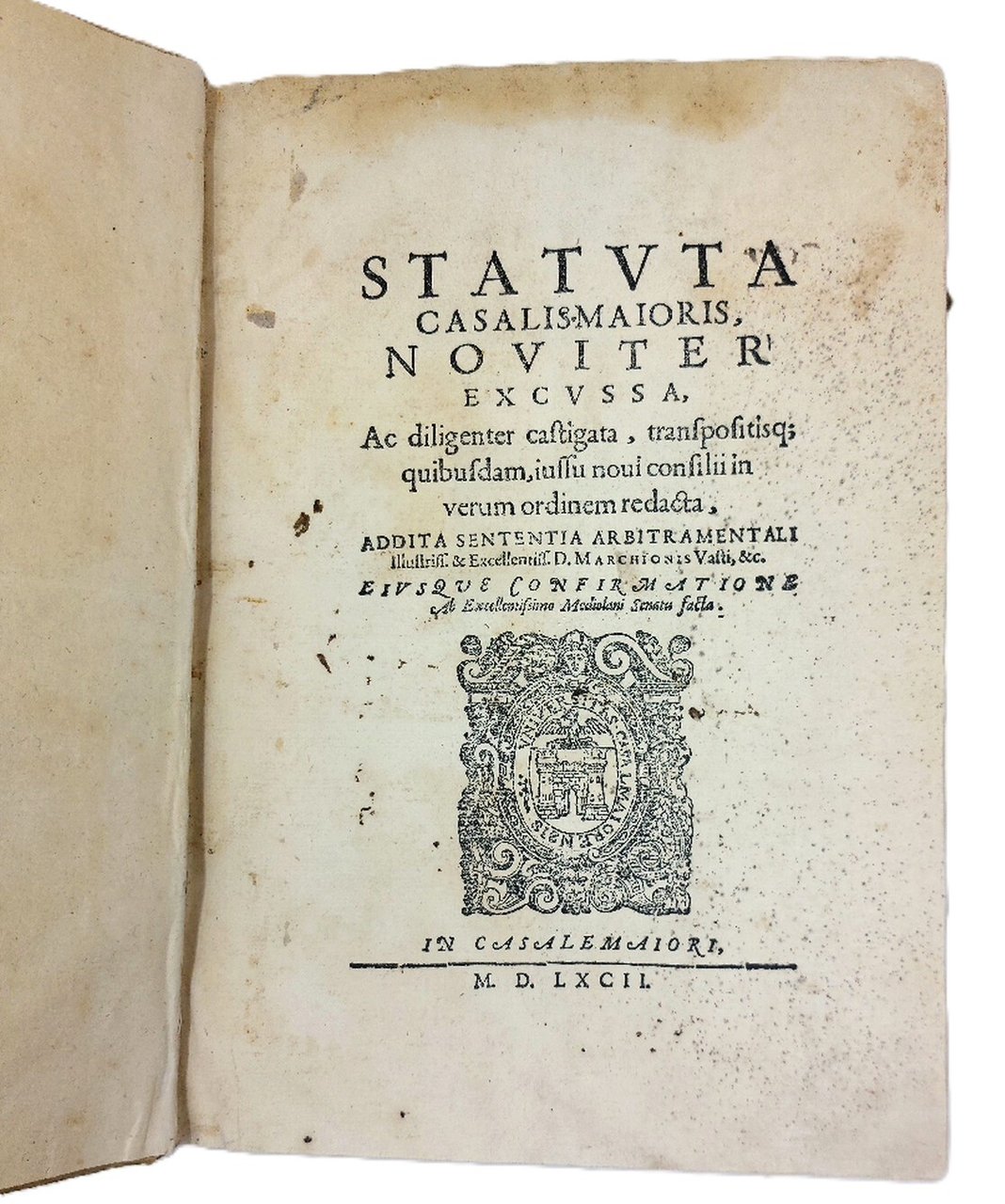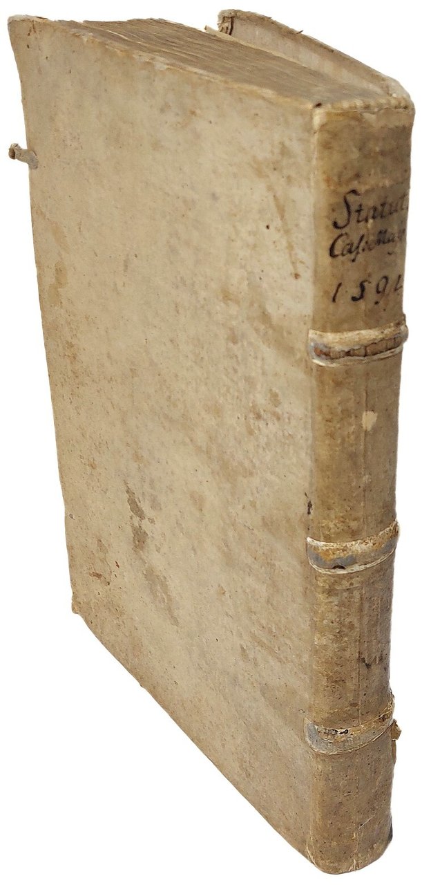 >in-folio, pp. (44), 280, (12), caratteri corsivo e romano, stemma della città sul frontespizio e del marchese Alfonso Felice d'Avalos, signore di Casalmaggiore al verso dello stesso (frontespizio in antico fac-simile). Legatura coeva in pergamena rigida con grandi nervi, titolo manoscritto al dorso e al taglio inferiore, tracce di bindelle (macchie e difetti della pergamena a tagli e cerniere, piccola spaccatura al piatto anteriore). Si tratta dell'edizione del 1590 (In Casalemaiori, apud Antonium Guerinum, & socium, 1590) con frontespizio diverso e l'aggiunta dei due fascicoli in principio (***6 e ✝⁴),contenti la sentenza arbitrale del Marchese del Vasto. "Questo codice rimase manoscritto per molto tempo finattantoché se ne fece un'edizione per la prima volta nel 1590, che fu ripetuta nel 1592 ". (Cfr. Storia di Casalmaggiore vol 10 p. 28). Non comune. Bell'esemplare, marginoso e fresco (salvo lieve alone d'umido margine su pochi fogli in fine), con frontespizio in antico fac-simile.