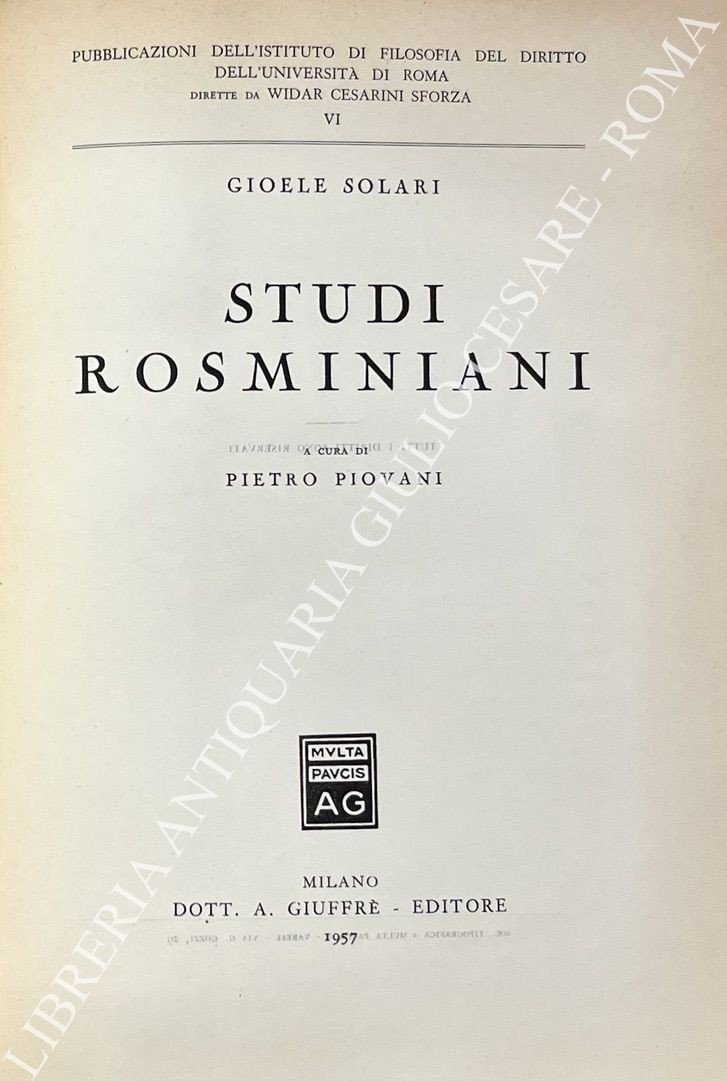 Studi rosminiani. A cura di Pietro Piovani | Livres anciens et modernes | Solari Gioele (1872-1952)