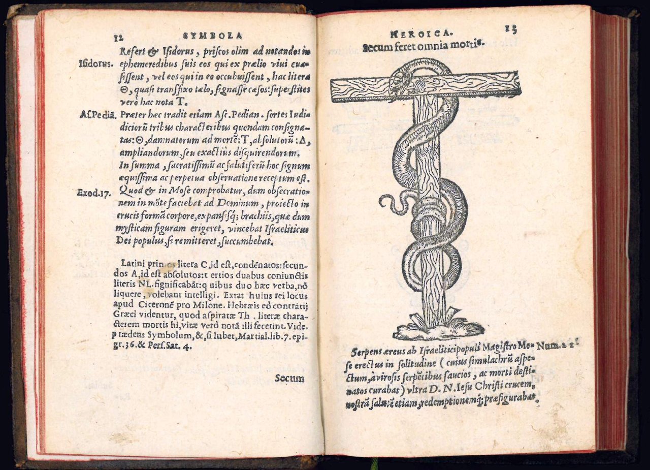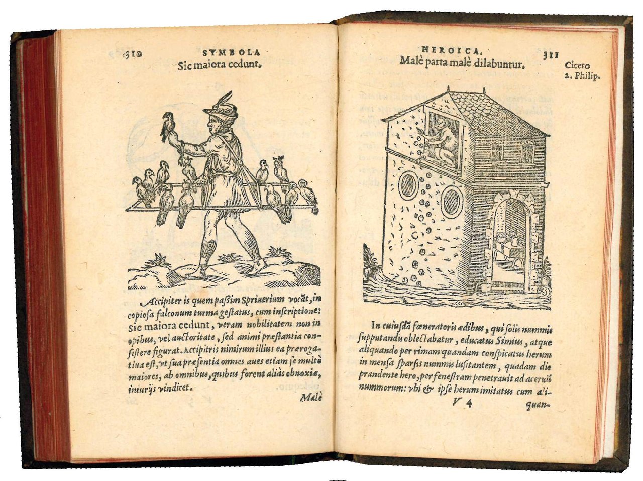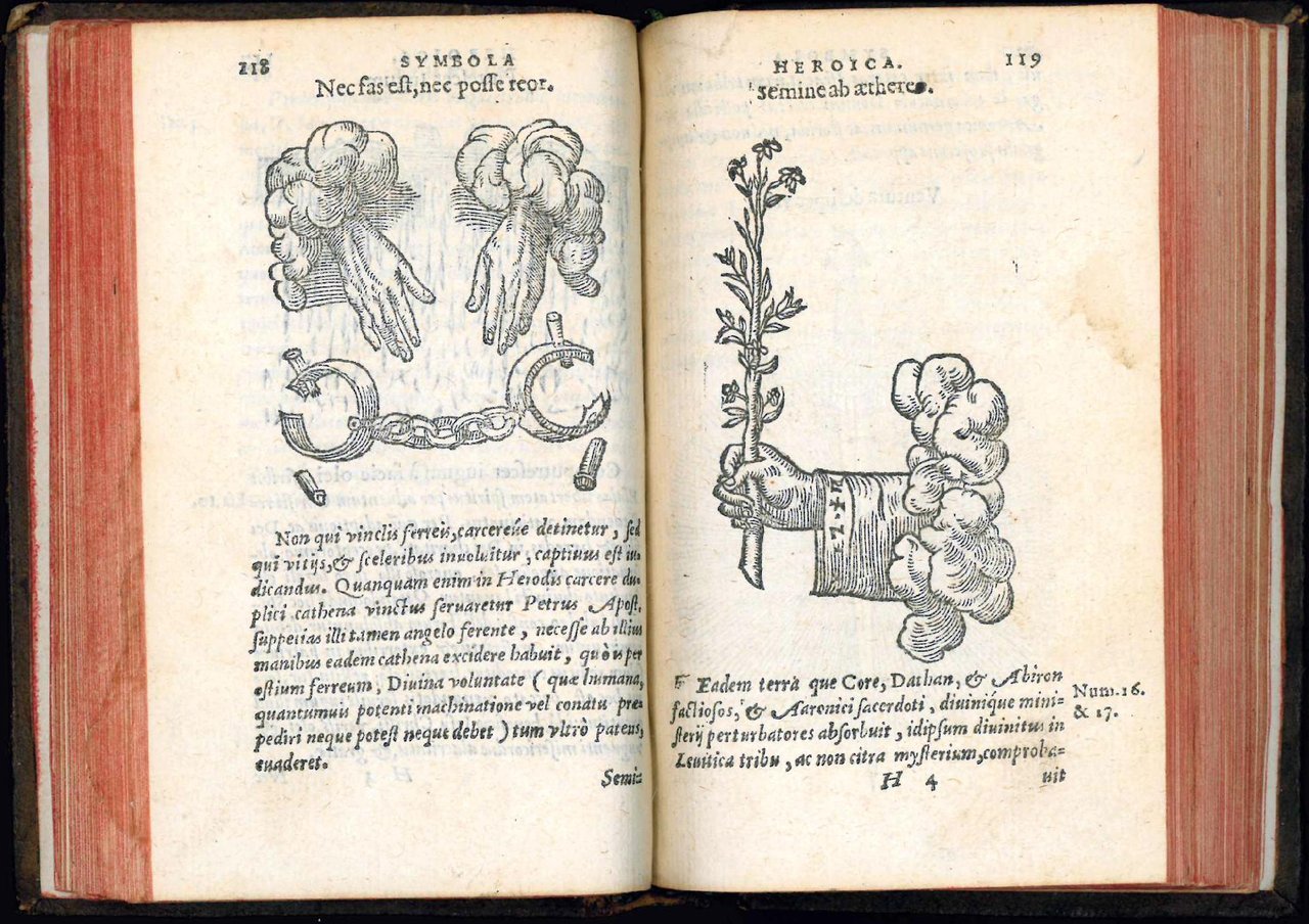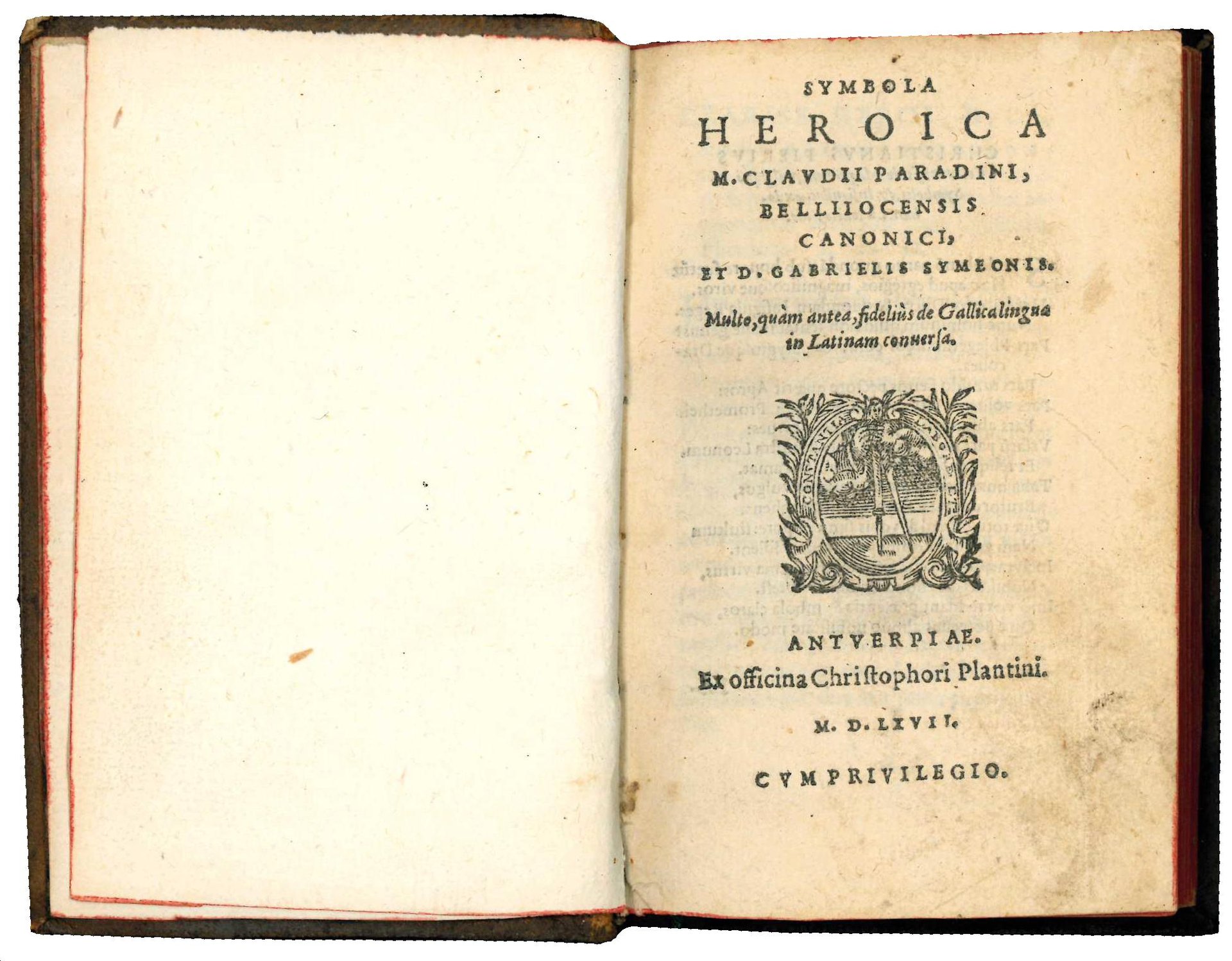 Nicely printed pocket edition of Claude Paradin's emblem book, first published in French by Jean de Tournes at Lyons in 1551. This is the second Platin Latin edition, corrected with respect to his first (1562) and with a new dedication, signed by him, to Charles de Berlaymont. Plantin had also published an edition in the original French (Dévises héroiques) in 1561.