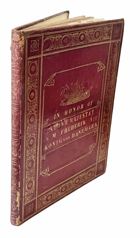 4to (277x212 mm). Lithographed portrait of the author as a frontispiece, 69, [1] pp. Hebrew and English text in parallel columns. Full red morocco gilt, front panel gilt-lettered “In Honor of Seine Majestat S.M. Frederik VII Konig von Danemark” and with the gilt coat-of-arms of the United Kingdom (worn and rubbed). On the front pastedown bookplate “Dr. Milton S. Ross”, some manuscript notes with dates according to the Jewish calendar, and another bookplate, belonging to the author or a member of the author's family, which depicts a tall man in a top hat in a gallery or museum holding a book, with the legend “A page of R.A. Belais”. Outer margins of the first four leaves repaired, pale browning throughout.