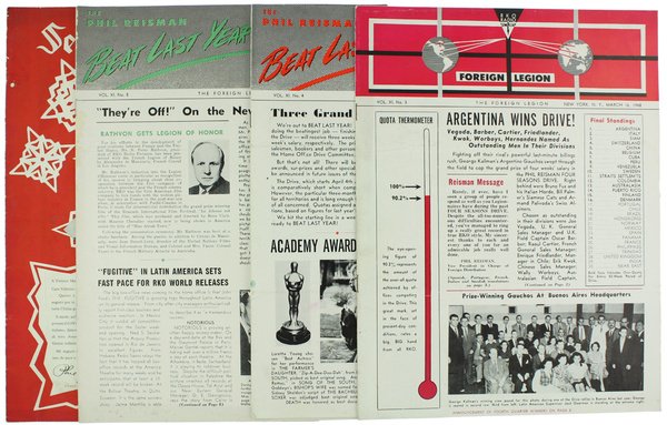 (Codice CN/1916) Notiziario settimanale in lingua inglese: presentazione dei films della RKO nel mondo. Lotto di 4 fascicoli: Vol. XI No. 3 - 4 - 5. Vol. 14 No. 8. Formato in 4° (31 cm), 8 pagine ogni numero, con molte fotografie. Brossura editoriale, tutti in buono stato. ~~~ SPEDIZIONE IN ITALIA SEMPRE TRACCIATA