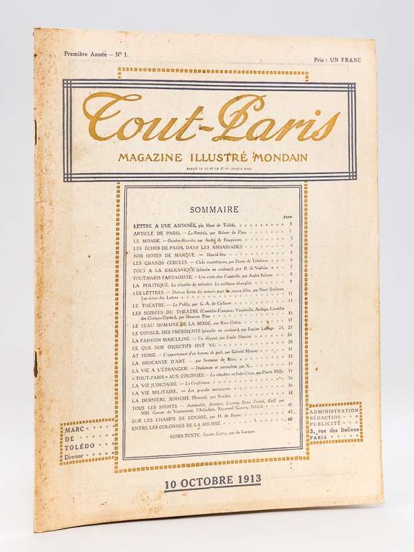 Tout-Paris. Magazine illustré mondain. Première année. N° 1 : 10 octobre 1913 | Livres anciens et modernes | Collectif, De Toledo, Marc, De Valerio, R. : De Losques, Laforge, Lucien