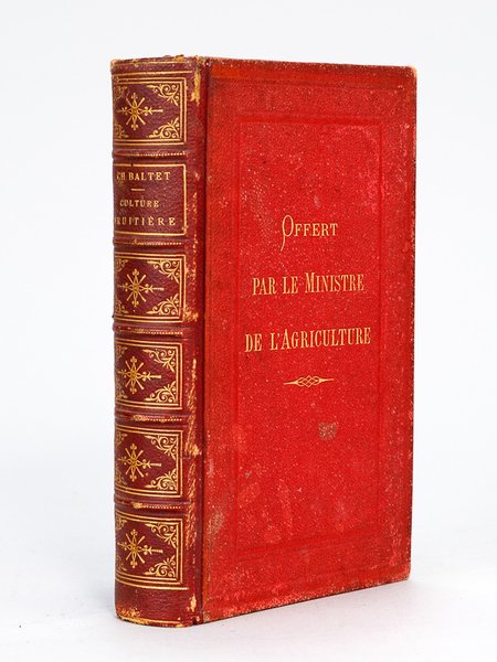 Avec 350 figures dans le texte, 1 vol. in-12 reliure de l'époque demi-chagrin rouge, dos à 5 nerfs orné, tête dorée, mention "Offert par le Ministère de l'Agriculture" au premier plat, G. Masson, Paris, 1884, IV-639 pp. Etat très satisfaisant (rel. un peu frottée des rouss.) pour cette édition originale peu commune. La plupart des cultures fruitières sont évoquées : abricots, amandes, cerises, châtaignes, coings, fraises, framboises, groseilles, noisettes, noix, pêches, poires, pommes, prunes, raisins.
