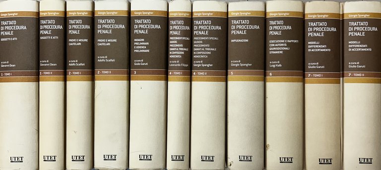 Trattato di procedura penale. Vol. I - Soggetti e atti. Tomo I: I soggetti a cura di Giovanni Dean; Tomo II: Gli atti a cura di Giovanni Dean; Vol. II - Prove e misure cautelari. Tomo I: Le prove a cura di Adolfo Scalfati; Tomo II: Le misure cautelari a cura di Adolfo Scalfati; Vol. III - Indagini preliminari e udienza prliminare a cura di Giulio Garuti; Vol. IV,1 - Procedimenti speciali. Giudizio. Procedimento davanti al tribunale in composizione monocratica. Tomo I: Procedimenti speciali a cura di Leonardo Filippi; Tomo II: Giudizio. Procedimento davanti al tribunale in composizione monocratica a cura di Giorgio Spangher; Vol. V - Impugnazioni a cura di Giorgio Spangher; Vol. VI - Esecuzione e rapporti con autorità giurisdizionali