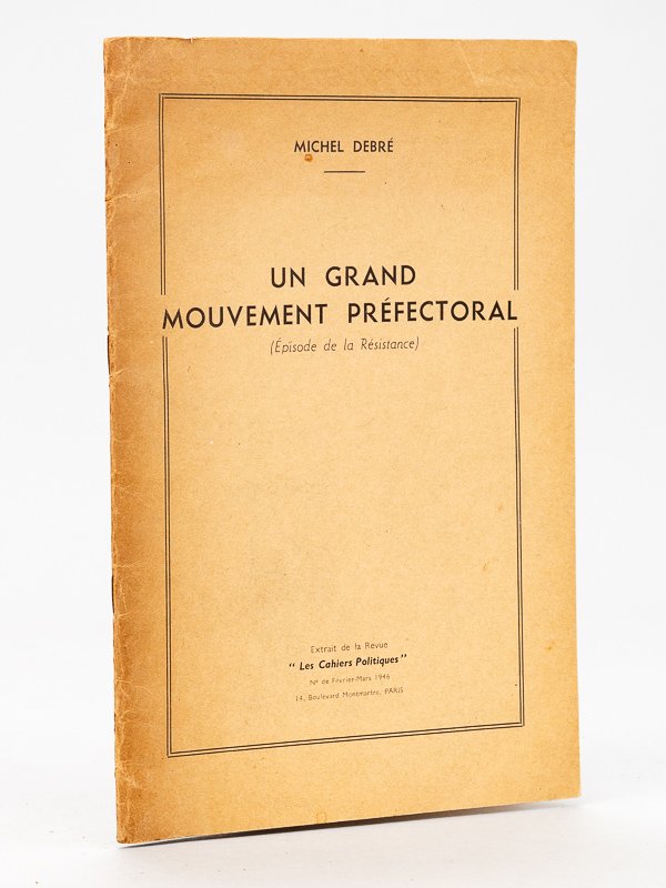 1 brochure in-8, Extrait de la revue "Les Cahiers Politiques", n° de Février-Mars 1946, Paris, 26 pp. Rare exemplaire de cet étonnant tiré-à-part, dans lequel Michel Debré évoque dans un style quasi romanesque '"Un pigeon becequette le nez camus d'Auguste Comte. Un Allemand en casque se dresse, les jambes écartées, devant le lycée Saint-Louis. Je m'en vais acheter une cartes des divisions administratives de la France") les préparations faites sous la Résistance pour l'institution d'un nouveau corps préfectoral à la Libération. Michel Debré était alors Maître des requêtes au Conseil d'Etat, commissaire régional de la République. Bon état