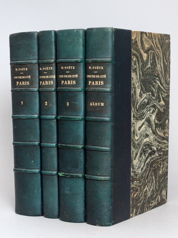 4 vol. grand in-8 reliure demi-chagrin bleu, couvertures conservéé, Auguste Picard, Paris, 1924-1931, XXXI-626 pp. avec plan dépliant ; 338 pp. ; 579 pp. avec grand plan dépliant ; 547 pp. avec 600 illustrations en noir et blanc. Rappel du titre complet : Une Vie de Cité : Paris de sa Naissance à nos Jours (4 Tomes - Complet) Tome I : La Jeunesse. Des origines aux temps modernes ; Tome II: La Cité de la Renaissance. Du milieu du XVe siècle à la fin du XVIe siècle ; Tome III : La spiritualité de la cité classique. Les origines de la cité moderne (XVIe-XVIIe siècles) ; Tome IV : Album Bon exemplaire bien relié (dos très lég. frotté et très lég. passé, très bel état par ailleurs). Impressionnant travail historique dans lequel Marcel Poëte fait oeuvre de pionnier en utilisant en permanence, et l'un des tous premiers, toutes les ressources des méthodes de l'urbanisme.