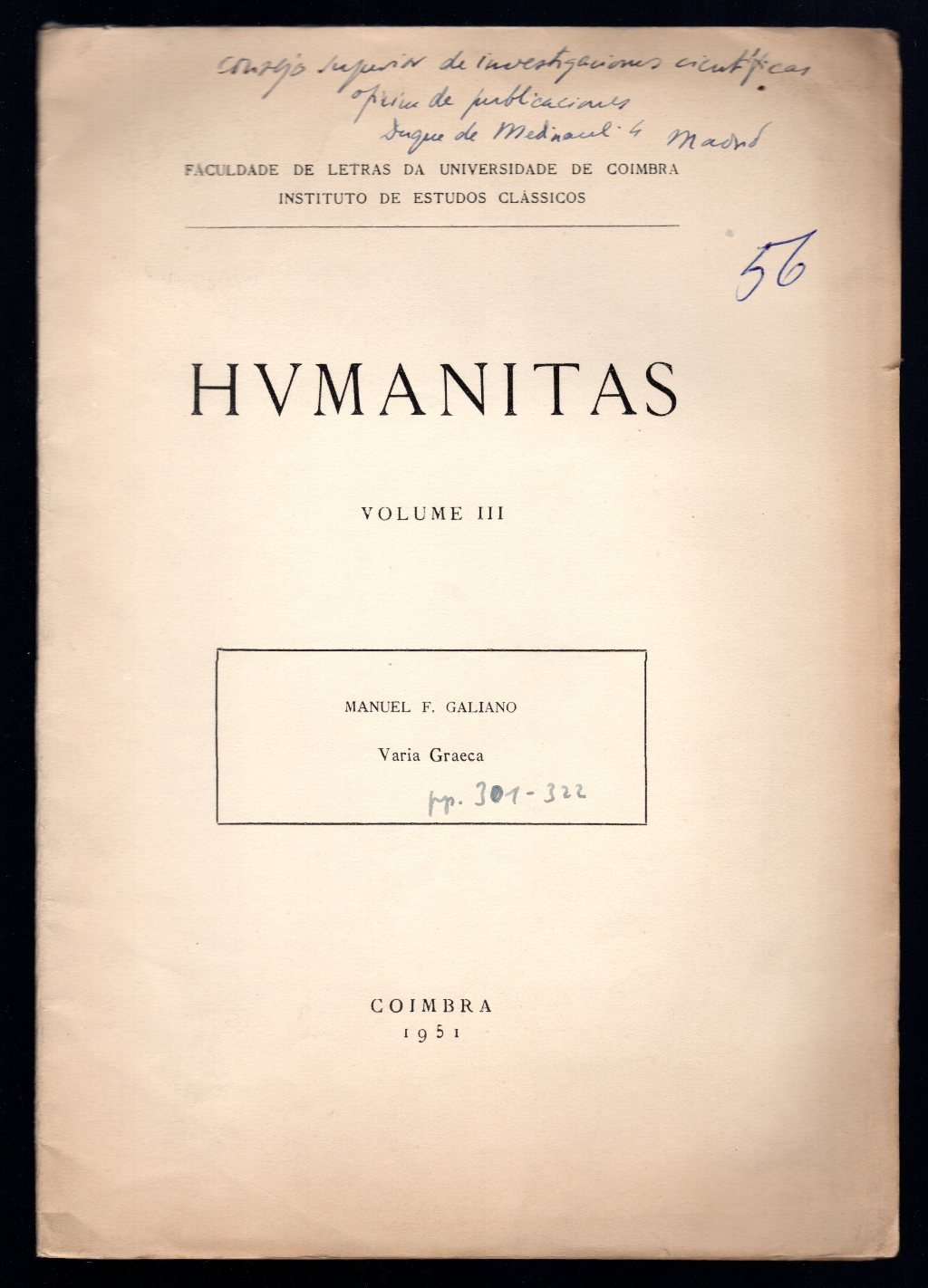 Opuscolo vintage in-8° con 22 pagg, Coimbra, 1951. Saggi. Testo in lingua spagnola. Humanitas volume III. Note a biro e dedica autografa in copertina. Note a biro in prima pagina.