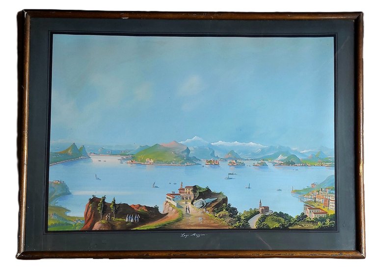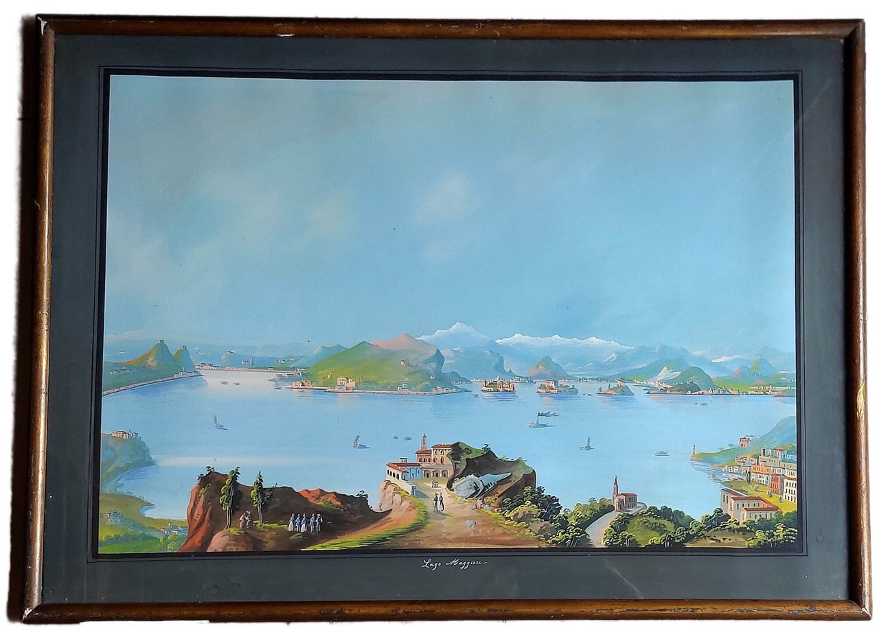 >mm 460x650 e ampio margine neo. Titolo "Lago Maggiore" al centro in basso. Stupenda grandiosa veduta, dipinta da ottima mano con colori luminosi di raffinato effetto. Perfetta conservazione. Le vedute a gouache dei laghi piemontesi e lombarde sono insolite e assai rare. Conservata in semplice cornice dorata del tempo.