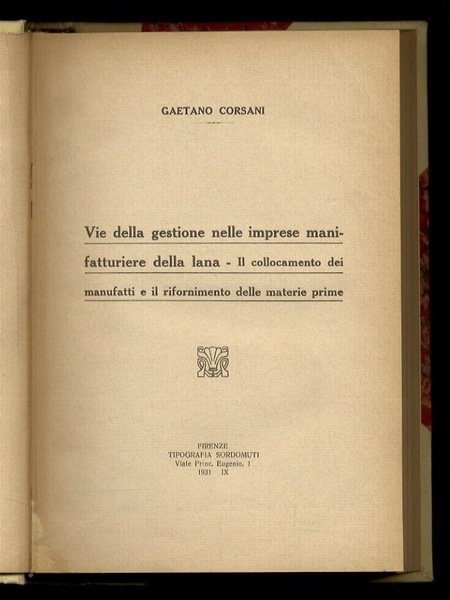 Vie della gestione nelle imprese manifatturiere della lana. Il collocamento dei manufatti e il rifornimento delle materie prime. | Livres anciens et modernes | Corsani Gaetano.