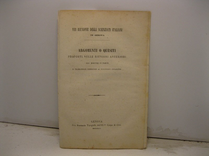 In 8, pp. 22. Elenco di quesiti e temi di cui il Congresso degli scienziati italiani riunito a Genova ha stabilito che si dovra' occupare. I quesiti sono divisi in sezioni: fisica e matematica; chimica; mineralogia e geologia; agronomia e tecnologia; botanica e fisiologia vegetale; zoologia; medicina; chirurgia.