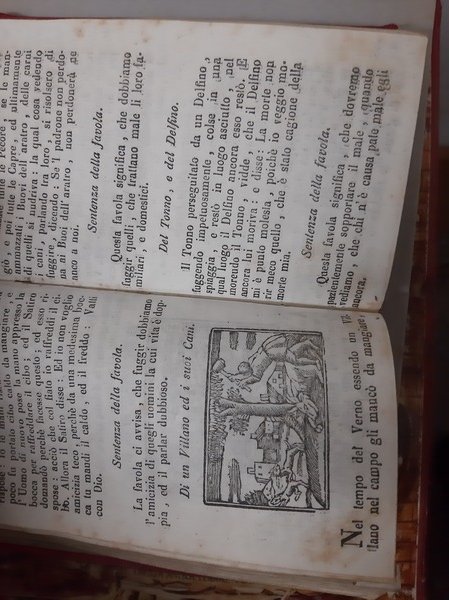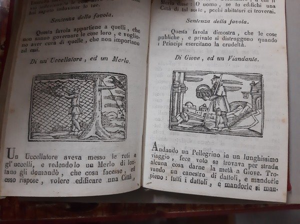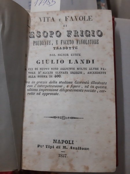 CUI DI NUOVO SONO AGGIUNTE MOLTE ALTRE FAVOLE D'ALCUNI ELEVATI INGEGNI, ASCENDENTI ALLA SOMMA DI 400. ORA IN GRAZIA DELLA STUDIOSA GIOVENTU ILLUSTRATE CON L'INTERPRETAZIONE, E FIGURE, E IN QUESTA ULTIMA IMPRESSIONE DILIGENTEMENTE RIVISTE, CORRETTE ED APPROVATE. Napoli, Pè Tipi di M. Avallone, 1857. In 16° piccolo, pp. 348 n. (ultime 8 pp. di indice a margine corto). Centinaia di vignette incise in xilografia nel testo. Tela non coeva. Fioriture ma buon esemplare.