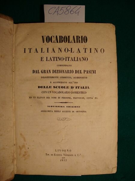 Vocabolario italiano-latino e latino-italiano compendiato dal gran dizionario del Pasini diligentemente corretto, accresciuto e accomodato all'uso delle scuole d'Italia con un vocabolario domestico ed un elenco dei nomi di persone, provincie, città ec.